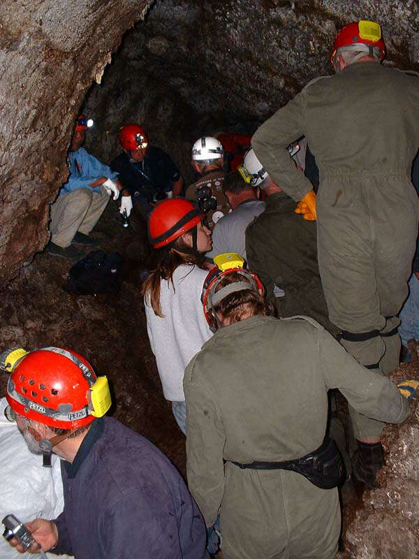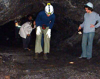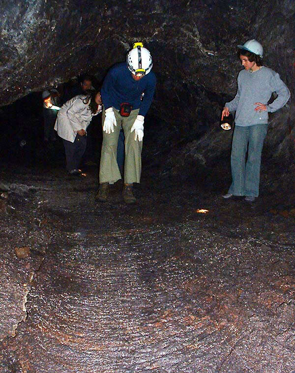 examines lava stalactites on a fallen piece of the cave’s ceiling.