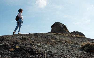 | From the campsite, you climb up a hill covered with pine trees and oaks. Here we see Susy heading uphill, bravely resisting the temptation to investigate the many orchids in the tree branches.
