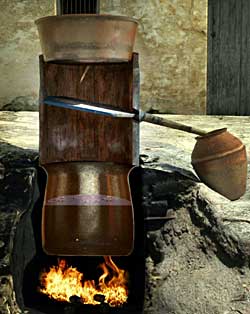 copper pot at the bottom. Vapors from the tuba boiling in the pot rise